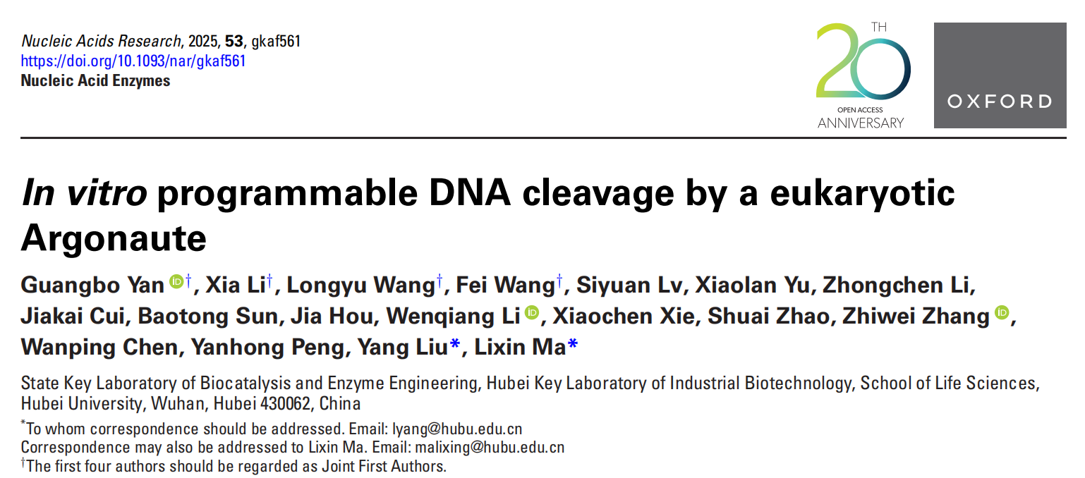 近日,英国365上市集团马立新教授团队在国际核酸研究领域顶级期刊《Nucleic Acids Research》(IF=13.1)在线发表题为“In vitroprogrammable DNA cleavage by a eukaryotic Argonaute”的研究论文(图1)。该研究首次揭示了嗜热真核生物来源的CsAgo蛋白质具有程序化切割DNA分子的全新功能,突破了传统认知中真核生物Argonaute蛋白质仅能靶向RNA的局限,为基因编辑工具库提供了新型分子剪刀。