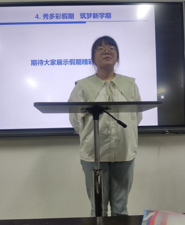 飞扬的少年最动人心,奔跑的时候,像是穿过了光阴。两个月转瞬即逝,时间容易冲淡一切,但“分享”可以锁住情感。安排过新学期工作后,胡老师带着大家打开了那封存的夏日记忆。胡老师先分享了她去招生宣讲、指导学生参加生命科学竞赛等等经历。之后同学们依次上台分享自己精彩的暑假记忆。有以张士毅、彭鑫圆等同学游玩广州、海南等地的大好河山;有以段世睿、肖雨何同学为代表参加支教志愿活动的分享,让大家跟随他们“润雨生花”服务队视角走进了神农架;有以陈啸、程思雨、王信陵君等为代表的同学分享了她们的暑期打工经历,让大家看到了工作的艰辛不易,也看到了我们同学的坚韧与成长;还有以彭圣浩、潘子龙等留校进实验室的同学的分享,让大家了解到了实验进行的严谨与枯燥和取得的成果时的满足与自豪,明白了成长永远是现在进行时……