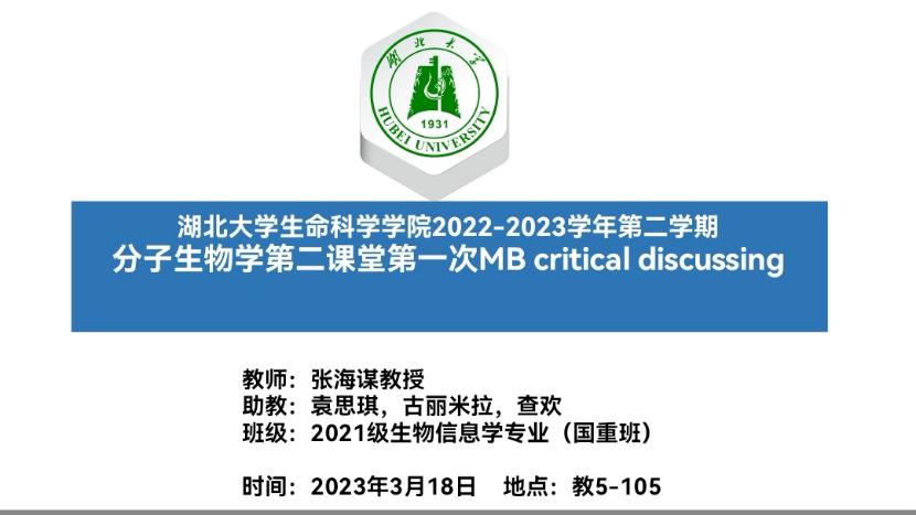 (通讯员:陈悦 陈博 陈永博)3月18日上午,张海谋教授主讲的《分子生物学》课程利用课外时间在教五105举行了本学期第一次讨论会,参加讨论会的除了2021级生物信息专业国重班的全体同学外,还有袁思琪、古丽米拉、查欢三位助教。本次讨论会旨在培养同学们“大胆假设、小心求证”的科学探究精神,前期引导同学们查阅书本和文献,中期同学们进行小组讨论,制作PPT汇报材料,最后在讨论会上展示。
