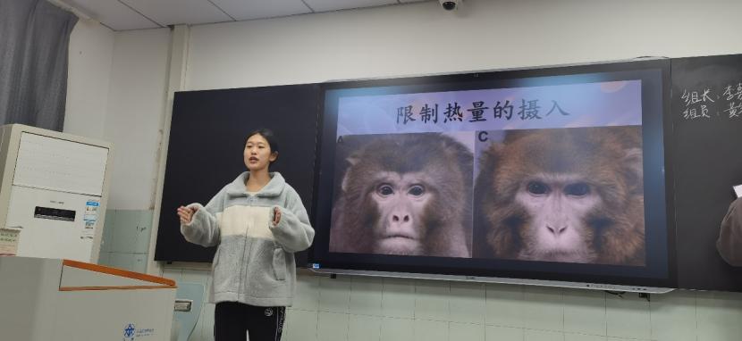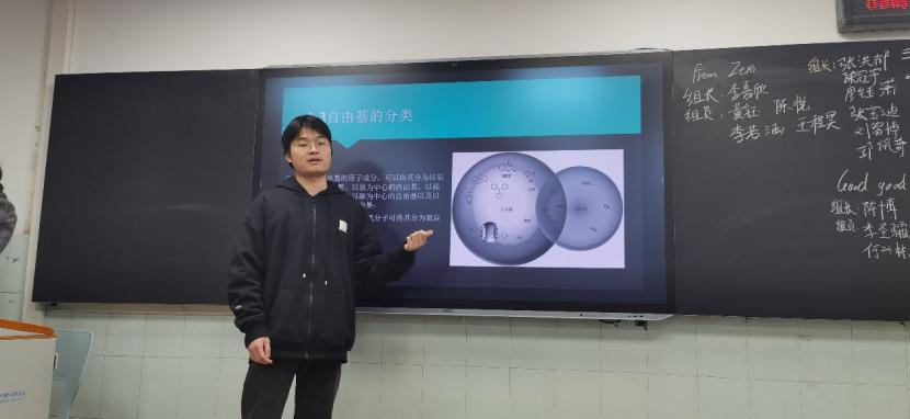 首先是第三组的同学对问题四和问题五进行解答:他们认为人类的生命是可以突破上限的;自由基会损伤细胞,损伤DNA导致突变,过多的细胞衰老表现为人体的衰老,但我们可以通过饮食补充萝卜硫素、木黄铜、多酚等物质,减少体内自由基的产生,延缓人体的衰老的过程。第一组的同学,针对这两个问题给出补充,他们认为如果单纯从端粒缩短导致人类寿命缩短的角度看,人类寿命是可以延长的,并且补充说明了自由基产生的具体原因。第五组的同学补充了自由基的分类和区别。之后其他四个问题也在同学、助教和张教授的讨论中,得到了属于同学们自己的答案。