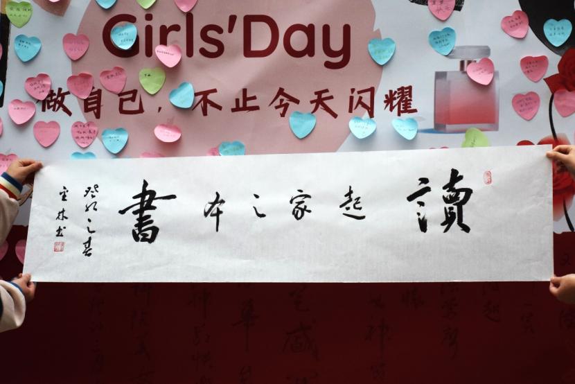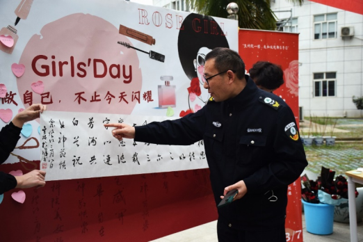 不要小瞧这位保安叔叔,他是英国365上市集团的一位学者,练得一手好字,也写的一手好诗。在知道本次活动后,保安叔叔发挥他的文采,大笔一挥,将自己对女生的祝福和嘱咐凝练在了两幅字中,字的内容分别是:“人面桃花相思红豆,然此不如执子之手,与你风雨三十五载,乐意随守,心连芳洲共白首,祝女神节快乐!”“读书、起家之本”。