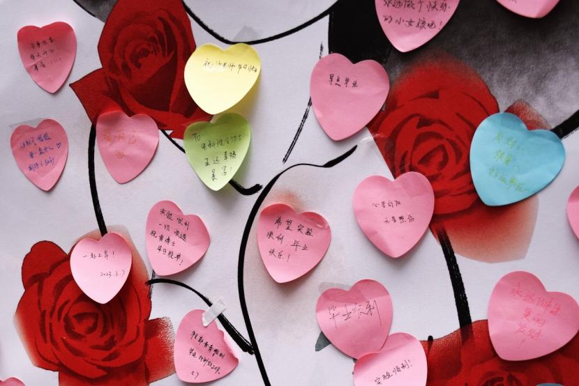 阳光透过树影,同学们的影子慢慢拉长,留言板装满了女生的心愿和男孩的祝福,厚厚的贺卡只剩几张,桶内满满的玫瑰随着每一位女生的梦想,在校园飞翔。