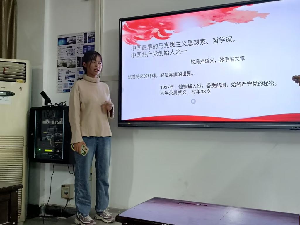(通讯员:柯聪 摄影:柯聪)2022年10月29日下午六点于教三603开展了团支书,团支书肖金芳主持了主题为 “追寻红色记忆,理想照耀青春”纪念李大钊同志诞辰133周年主题班会活动,以此表达对革命先驱李大钊同志的崇敬和怀念之情,引领和鞭策新时代青少年铭记先辈付出,传承发扬李大钊先生的信仰与追求、责任与担当、气质与情怀,争做铁肩担当的好少年!