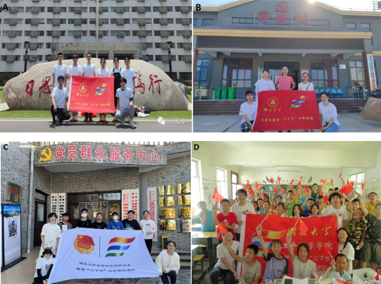 (A)江河复岸实践团队;(B)糖尿病及非酒精性脂肪肝的防治与个体化医疗知识科普项目团队;(C)生态文明建设与脱贫攻坚建设“双赢”项目调研小队;(D)红声传唱党史宣讲团