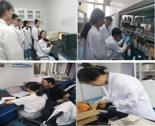 (A)药理学实验室老师讲授仪器操作规范;(B)药物化学实验室老师讲授化学反应原理;(C)药物化学实验室老师指导学生检索资料;(D)药理学实验室同学独立给小鼠灌胃药物
