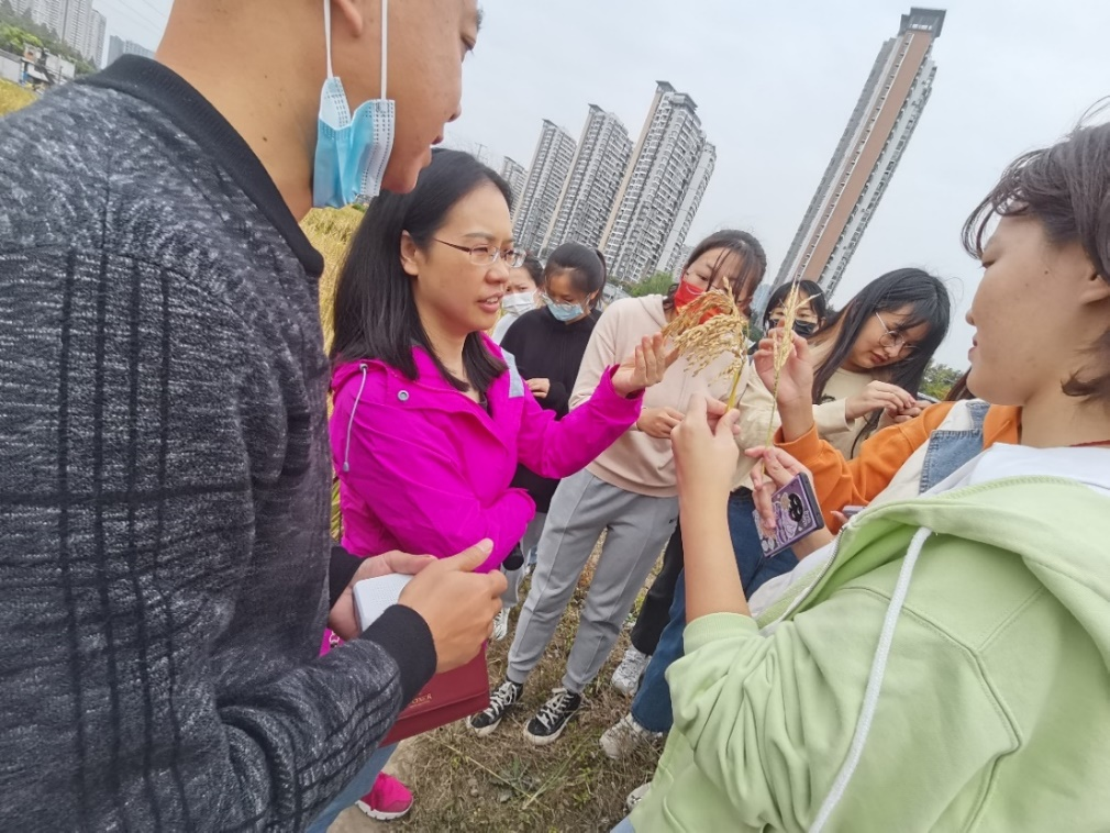 (图为张献华老师为2020级药学产业班同学讲解水稻知识)
