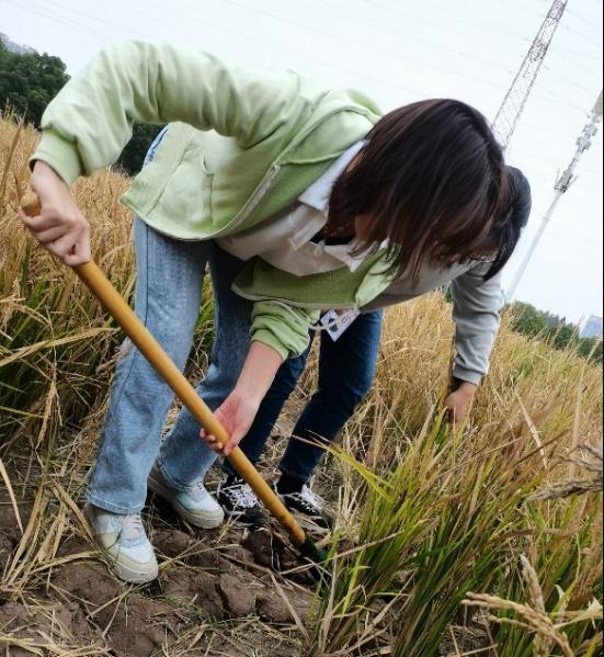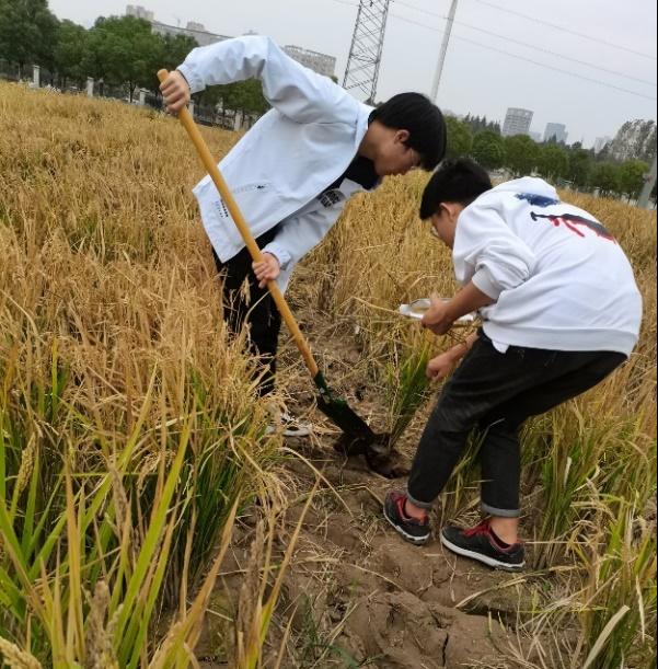 在了解相关的理论知识后,班级成员手持铁锹,进入试验田,回收水稻育种材料稻兜。在劳动的过程中,我们发现耕种是辛苦的,铁锹或许会磨破手指,力气不够无法铲土,缺乏经验难以实行,但班级成员并未放弃,几人成组,团队合作,以劳动者的姿态体验了劳动的幸福和快乐!