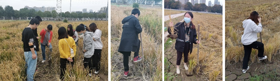 接着,在周玉玲老师和张献华老师的指导和帮助下,同学们开始了今天的劳动实践——使用铁锹从稻田挖取并回收水稻育种材料稻兜。许多同学之前并没有下过稻田,也没有用过铁锹,比较陌生,难以操作,通过老师手把手的指导,逐渐掌握技巧,在劳动过程中也越来越熟练。每一位同学都积极参与劳动,凭借自己的努力挖出稻兜,获得了满满的成就感。