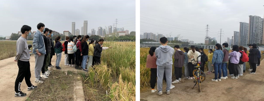 接着,张献华老师带领大家深入细致地观察稻田里的一些品种。野生稻较高,稻穗少而干瘪;栽培稻较矮,稻穗多而饱满。它们的杂交子代在株高和穗形上综合了两亲本的特性,但却没有种子。“就像骡子没有生育能力一样。这就是杂交不亲和现象,无法进行同源配对,因此我们需要将其变成异源多倍体。”张献华老师介绍道,他的老师蔡得田教授解决了多倍体水稻结实率低的问题,将多倍体水稻的应用推向“最后一公里”。而如今,他们水稻团队的主要科研任务是进行水稻的远缘杂交与多倍体化。