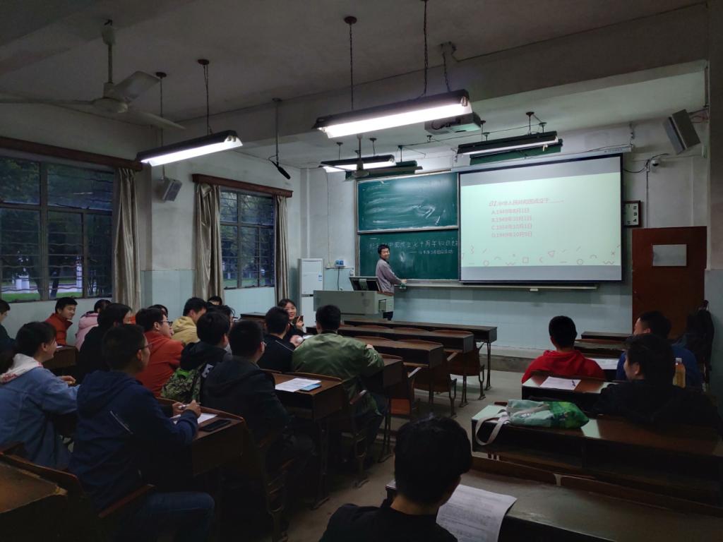 班会上由团支书熊泽生简介了本次班会的活动形式以知识竞答的方式进行新中国知识学习,随后进行了活动前的准备,使得班上同学集中起来。宣传委员周鹏负责本次班会的拍摄工作,组织委员杨生利负责分发为本次班会准备的学习材料,随后通过播放PPT展示题目,并以击鼓传花形式进行了活动答题,主持人对其中一些相关知识点进行了适当讲解,让同学们加深认识。在活动过程中,同学们的注意力被游戏逐渐吸引起来,因而游戏形式在答题时也起到了加深印象的作用。活动过程中穿插有对某些题目的讲解,对同学们了解国家相关政策方针,关注社会热点起到了积极引导作用,下发的新中国成立的相关学习资料从侧面对班会内容进行了扩充,使得大家对国家的重大历史事件,如外交,国防等方面事件有了一个更充分的了解。