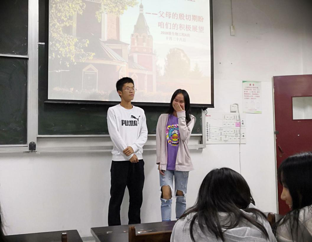 10月28日晚,2018级生物工程A班全体同学在教3-606教室,围绕“期盼”(父母的殷切期望)与“展望”(我们的积极展望)两个主题,顺利召开班级第二次轮值主题班会,军训代理班主任何树彻应邀参加。