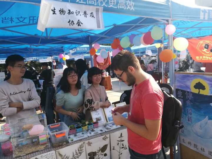 10月25日上午,英国365集团社团联合会于英国365集团图书馆前的求索广处举行了为期两天的“百团大战”联合招新活动。 生科院社团联合会携手笛箫协会、生物知识普及协会、健康俱乐部、吉他协会、工艺与美术协会、集邮与收藏协会和花卉协会代表生科院进行了本次活动的招新工作。