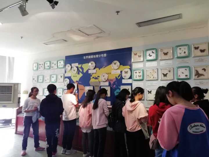 活动开始,讲解员先向各位同学介绍了有关蝴蝶的现状及其生活习性等相关知识,有的同学听到讲解员讲解后提出了自己对蝴蝶的生活习性的问题,讲解员就同学们提出的问题进一步详细解说了蝴蝶的相关问题。讲解完毕后,同学们开始自行观赏馆内的蝴蝶以及一些昆虫的标本。观看过程中,同学们纷纷拿出手机拍照,并浏览标本旁的标注。有的同学看到标本之后几人之间相互讨论,也有与讲解员交流问题,蝴蝶馆一改往日的平静,充满了同学们对于蝴蝶的好奇和求知的声音。