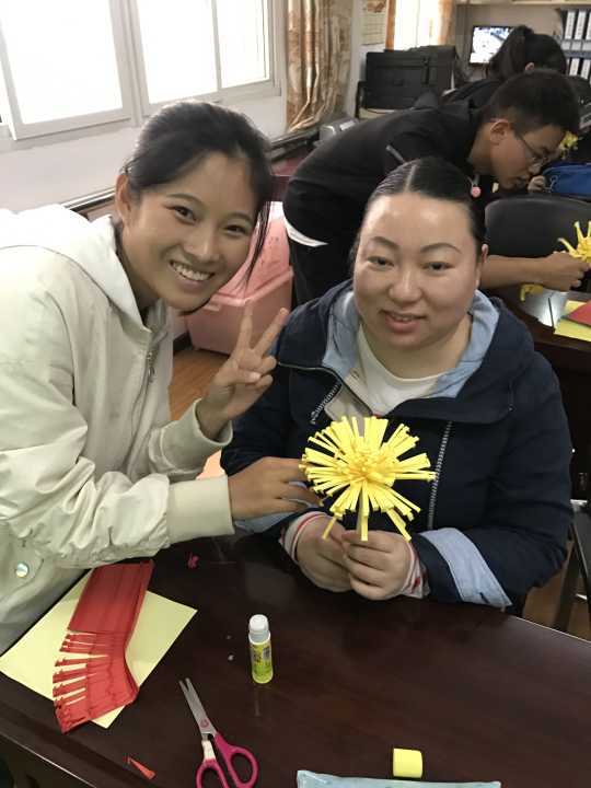 首先,新志愿者向学员们做了自我介绍。接着,志愿者们通过PPT展示向学员介绍了重阳节的来历以及重阳节的习俗:敬老,登高和插茱萸等。除此之外,志愿者还教授了学员们与重阳节有关的诗篇——“独在异乡为异客,每逢佳节倍思亲”。一系列活动之后,志愿者带领学员们一起进行手工纸菊花的制作。看到手中精致的纸花,学员们脸上都洋溢着幸福感与满足感。在活动结束时,志愿者还得到了学员们赠送的小礼物。