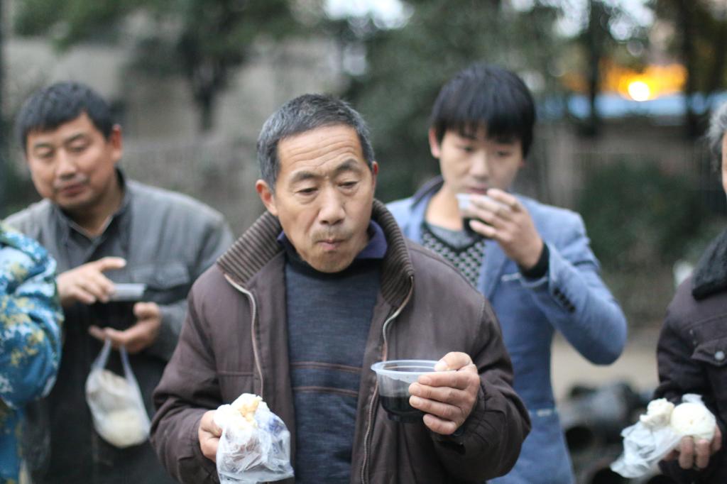 志愿者到时,工人们还在努力的排去路上的积水和砌墙。“师傅们,天气寒冷,快来喝杯热姜汤驱驱寒吧。” 一杯杯热乎乎的姜汤送到工人手中,姜汤的热气扑上了工他们的脸庞。工人们围着站在一起,一手一碗姜汤一手一块馒头或包子有味的吃了起来。“来这做工一个月多了,还第一次有