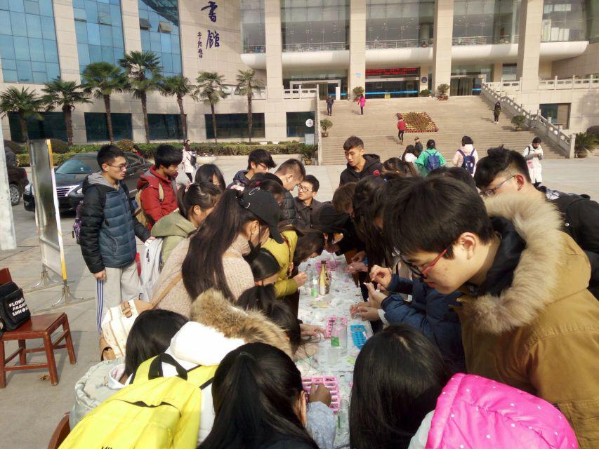 12月14日的图书馆前,由生普协会与集邮与收藏协会合办的一场琥珀制作大赛,吸引了很多人的目光。在不大的琥珀制作台旁,围拢了很多前来学习制作琥珀的同学。虽然天气寒冷,依然难以阻挡同学们的热情。