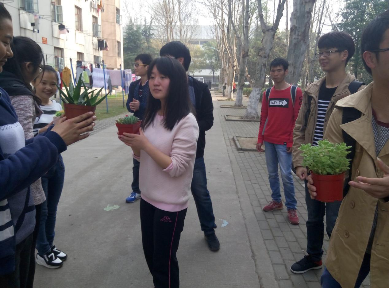 在女生节到来前,14级药学班的班长带领班上的男生来到花鸟鱼虫市场,为每个女生寝室精心挑选盆栽。经过几番的筛选,他们为几个女生寝室购买了多肉、仙人球、芦荟等各式各样的花卉。在3月7日的早晨,男生手捧盆栽,来到了10栋门口,将一盆盆精美的花卉递到了女生的手中,并同时献上了“越变越女神,女生节快乐!”的祝福。面对形态各样、五彩缤纷的花卉,女生们也显得十分兴奋。她们纷纷表示,在女生节能收到这样的礼物,给了她们一个大大的惊喜,更让她们感受到了来自“汉子”们的温暖。