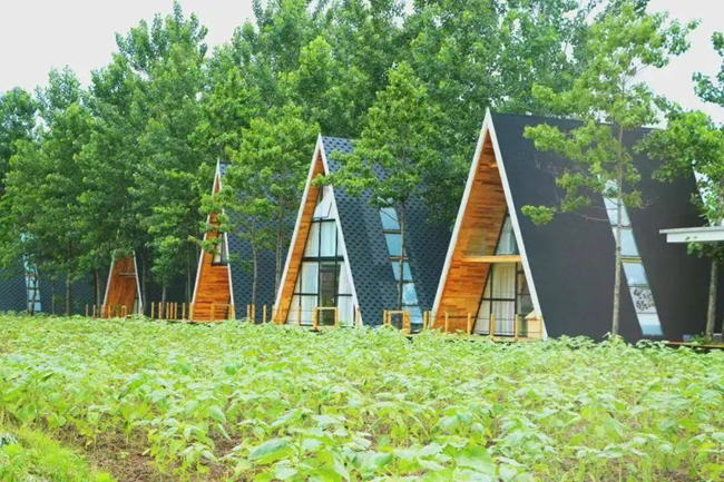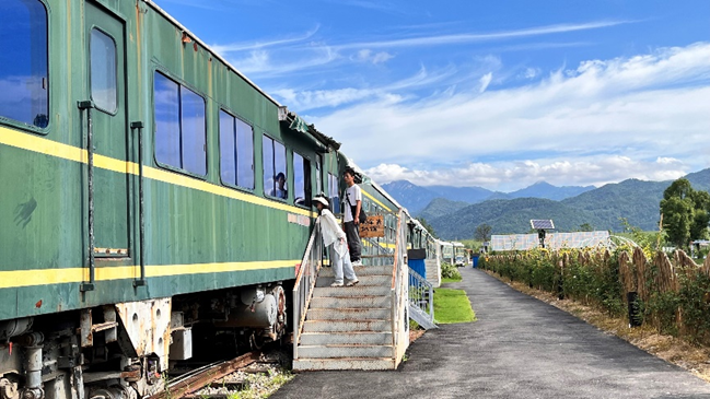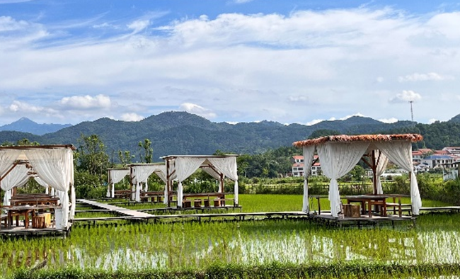 一进入袁夫稻田农场,映入眼帘是那一溜绿皮火车餐厅和一片鲜花田园。袁夫稻田以“永续友善”为发展理念,在不改变土地用途的前提下,将农业的产业环节与旅游文化产品对接,打造集生态种植、大米生产、观光游览、自然教育、火车餐饮、度假民宿等为一体的休闲农业,是一个围绕着山、水、人、田地做文章的新型农场。