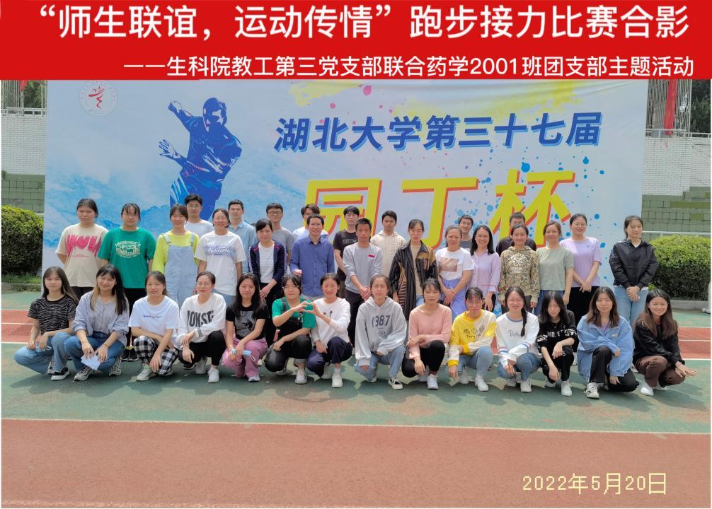 (通讯员:黄宁华)2022520⽇下午,生科院教工第三党支部联合药学2001班团支部二号体育场开展“师生联谊,运动传情”跑步接力比赛在班主任蔡文涛老师指导下,班长王思晨进行活动策划,教工第三党支部及药学2001班团支部的成员参加接力比赛。此次接力比赛旨在激发同学们的锻炼热情,增加师生之间的感情交流,发扬团队协作精神,营造团结向上、积极进取的氛围。