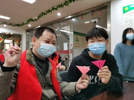 本次活动中,志愿者给愈合花园的学员们介绍了踏青活动,并且分享了自己外出游玩的经历,用一张张照片将大家拉近自然:东湖之眼,索道上的风光,樱花园,小池里游动的鱼儿,那份感受自然的欣喜和惬意也真切的传入了他们的心中。为了让大家更加了解自然的美丽,志愿者们还播放了纪录片,里面的瀑布,草原,云雾缭绕的大山,也让人心生向往,充斥着蓬勃的朝气。之后,志愿者与学员们一起进行折纸游戏,通过游戏的形式让志愿者和学员们彼此熟络起来,大家脸上都洋溢着欢乐的笑容。志愿者们全都耐心指导,与学员们共同完成了一件件美丽的纸蝴蝶,一朵朵绚丽的纸花朵。在此过程中,学员感受到的不仅仅是游戏的乐趣,更多的还有对自然的热爱。活动最后,志愿者同学员们一起在天台上修剪绿植,以满眼绿意治愈伤痛之心。天气回暖,大家坚信以后的日子也会充满了希望。