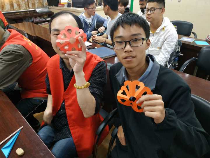 首先志愿者们开展了阳光小课堂,在这个环节里,志愿者们通过PPT和模拟情景再现,向学员们讲解了有关诗词歌赋的知识内容,并且还加入了有关的提问环节来考验学员们的记忆力。随后便是学员们感兴趣的手工课---剪纸,一张张五颜六色的纸在志愿者与学员们的手中变成了一个个生动的图案。值得一提的是,本次活动有两名国际志愿者的参与,他们与学员们一同剪纸,并相互交换了作品。
