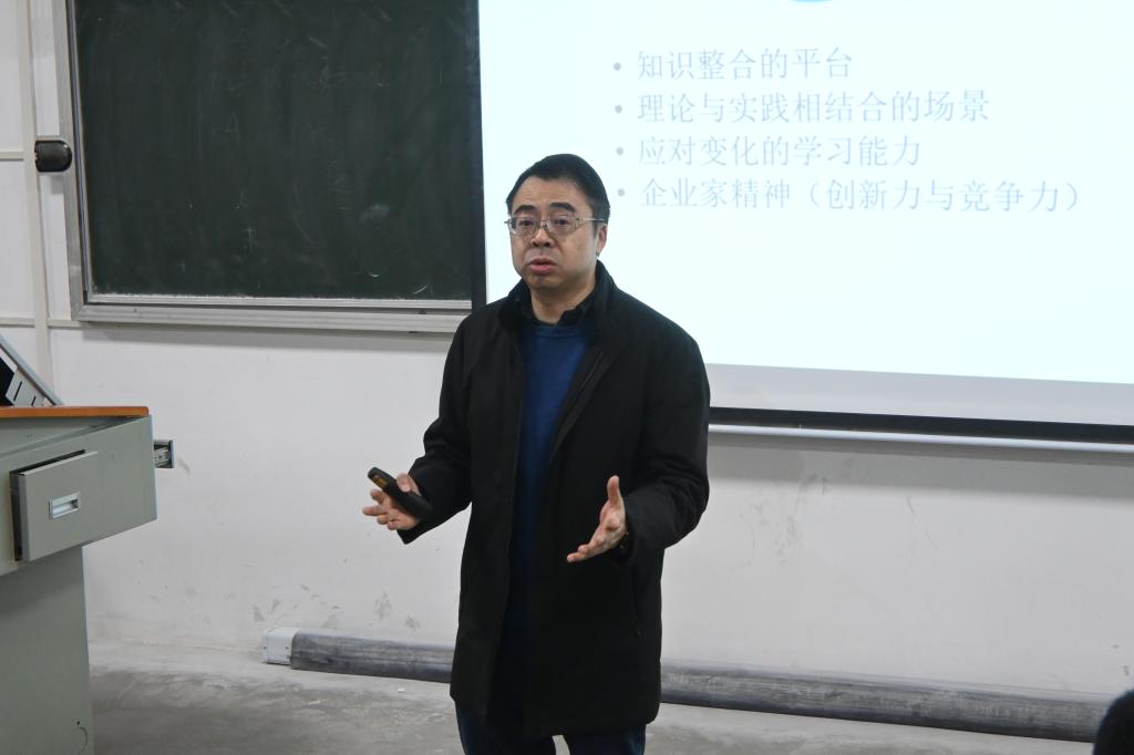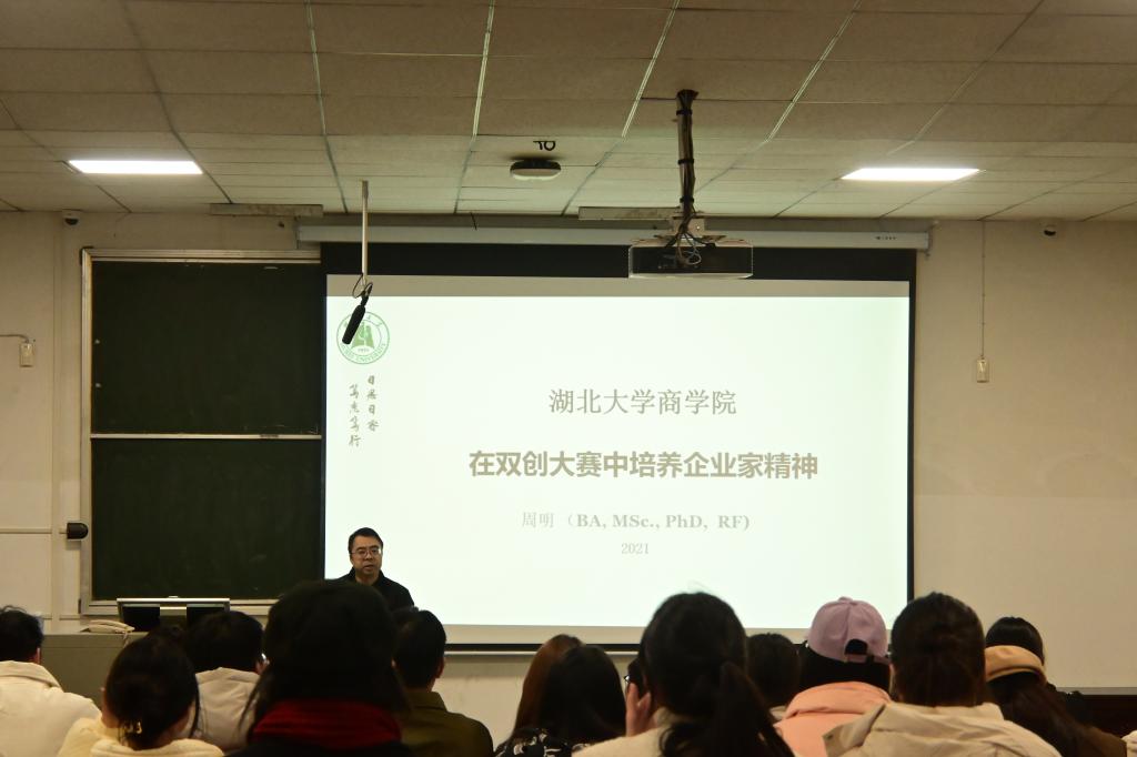 会议开始,周明教授首先进行了自我介绍,向同学们分享了自己有关于双创大赛的经验,他提到自己指导比赛至今已有17年,获奖高达73项,包揽了各大奖项,成功孵化过6家学生创业企业。紧接着,周教授以幽默的口吻指出他对于创业活动的看法是“上课的学生不创业,创业的学生不上课。创业的老板不授课,授课的教授不创业”。