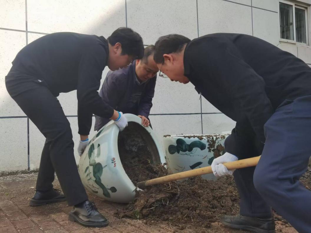 莲花缸都被搬到室外空地后,他们分工合作,两人慢慢倾斜,扶稳莲花缸避免其滚动,一人用铁锹铲出里面的旧泥土并铺平,其他几人配合仔细翻找土里还能存活的莲花苗,清理干净淤泥与苔藓,保障新莲花的生长环境。谢书记熟练地拿着铁锹铲土,他认真刮下粘在莲花缸壁的泥土,将它们拨开摊平,配合翻找莲花苗的同学和老师,给其他师生树立了一个好榜样。男同学们主动承担起铲土的力气活儿,女同学们则默契地蹲下身,耐心地挑出烂掉的淤泥和根须。清理干净的泥土经太阳光自然晒干灭菌后便可再次投入使用。铺好翻新的泥土,再向莲花缸注入干净水,埋下充满生机活力的莲花苗,等夏季悄然而至,一朵朵美丽的莲花就会绽放在生科院的大厅,香远益清。