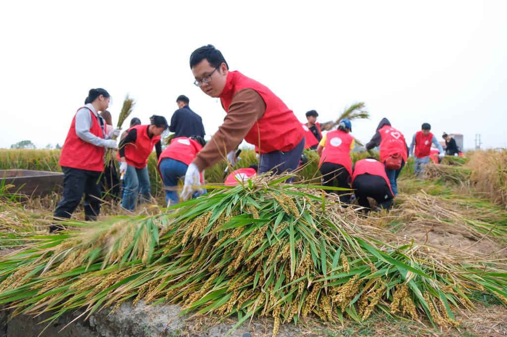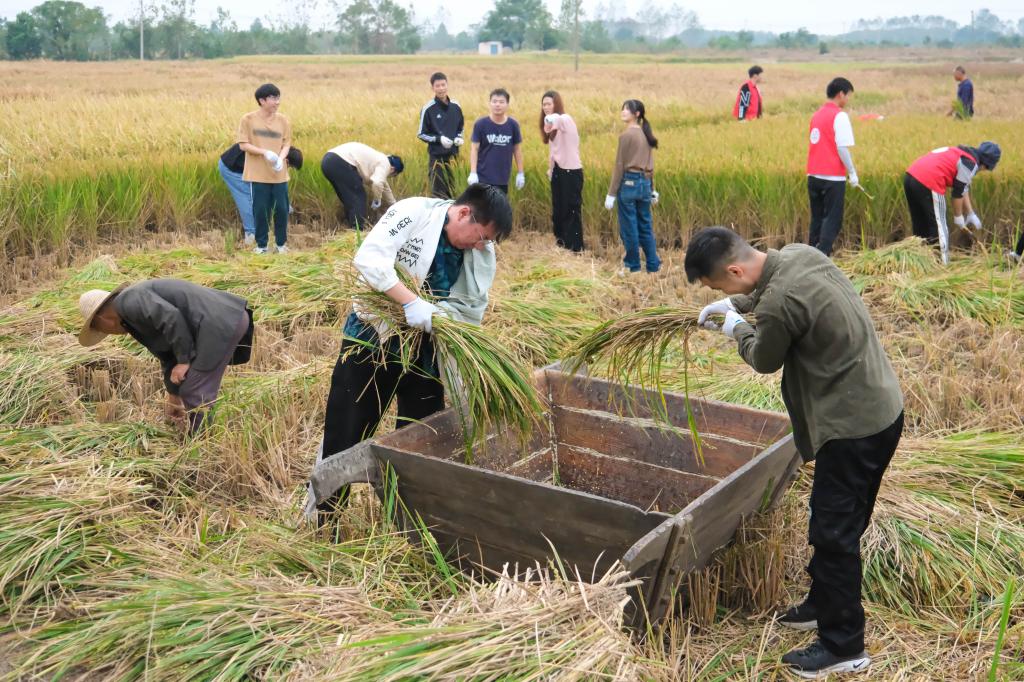 随后,师生们共同走进田间进行水稻收割和脱穗,每个人干劲十足。左手一轮抓住一丛稻杆,右手握住镰刀在稻杆下部略低处用力一拉,“唰”的一声,一丛稻穗就被顺利收割。集众人力量,不到一小时的光景,一片稻田的收割任务就完成了。