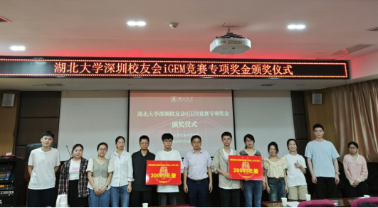 为了激励更多湖大学子投身科研创新,深圳校友会给每支获得iGEM金奖的队伍人民币30000元的奖励,鼓励在校学生积极参与高水平学科竞赛,不断攀登科学高峰。