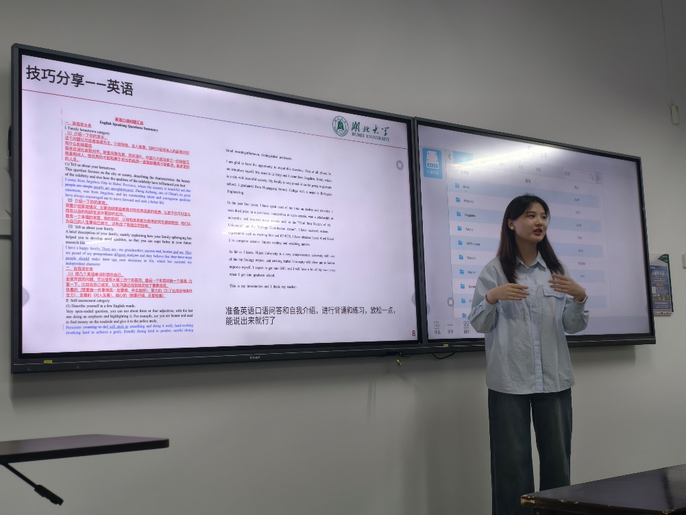 首先为同学们介绍考研复试经验的是学院研究生李馨怡学姐从复试材料筹备到心理调适层层拆解复试核心。她指出,简历是复试中展现个人优势的重要工具“精准狙击”导师需求,重点呈现科研经历、竞赛奖项及实践成果,避免冗长。李馨怡建议同学们可以在复试前进行多次模拟面试,来直面面试带来的压力并录制视频复盘语言表达、表情管理等细节,来缓解面试带来的紧张情绪。针对英语口语,她建议考生每天进行口语练习,尤其是针对常见的面试问题和英语的自我介绍。她提到,流利的英语表达可以为复试加分不少。 最后,李馨怡分享了一个心理学小技巧在复试前通过想象自己成功的场景来增强自信心。