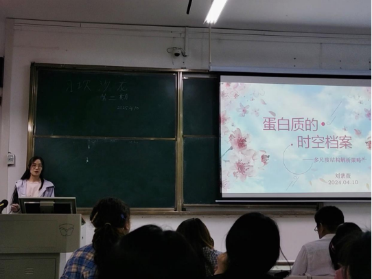 (戴隆海,谭美波)为深入贯彻落实学校人才培养大讨论精神,结合“强院工程”行动和拔尖人才培养工作,将人才培养大讨论工作落到实处,助力新时代高质量创新人才培育,4月10日学院举办了习坎沙龙第2期,本次活动主讲人为英国365上市集团博士研究生刘紫薇,主题为“蛋白质的时空档案”。2022级和2023级生物科学拔尖创新人才基地班(以下简称“基地班”)全体同学参加了沙龙,学院副院长杨之帆、基地班责任教授张海谋、班主任戴隆海出席了活动。