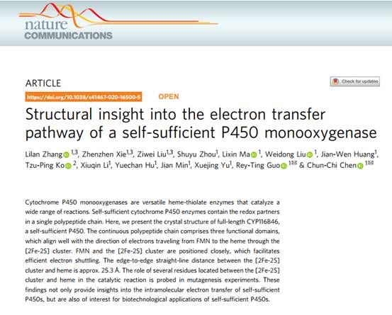 近日,省部共建生物催化与酶工程国家重点实验室陈纯琪教授研究团队和马立新教授、郭瑞庭教授共同合作,首次报道了自给自足P450酶的全长三维结构,相关研究以“Structural insight into the electron transfer pathway of a self-sufficient P450 monooxygenase”(«自给自足P450酶的全长结构与电子传递途径»)为题发表在Nature Communications(图1)。