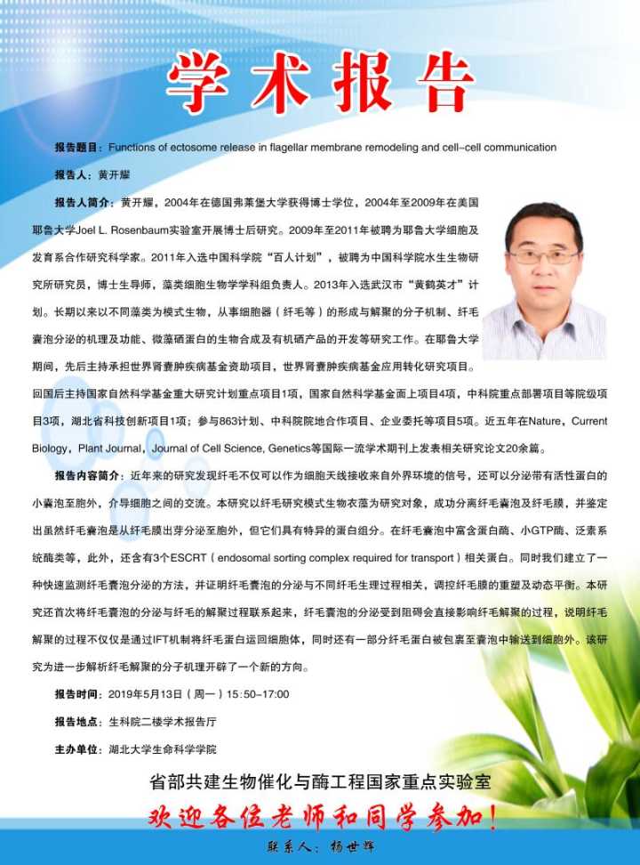 学术报告:Functions of ectosome release in flagellar membrance remodeling and cell-cell communication