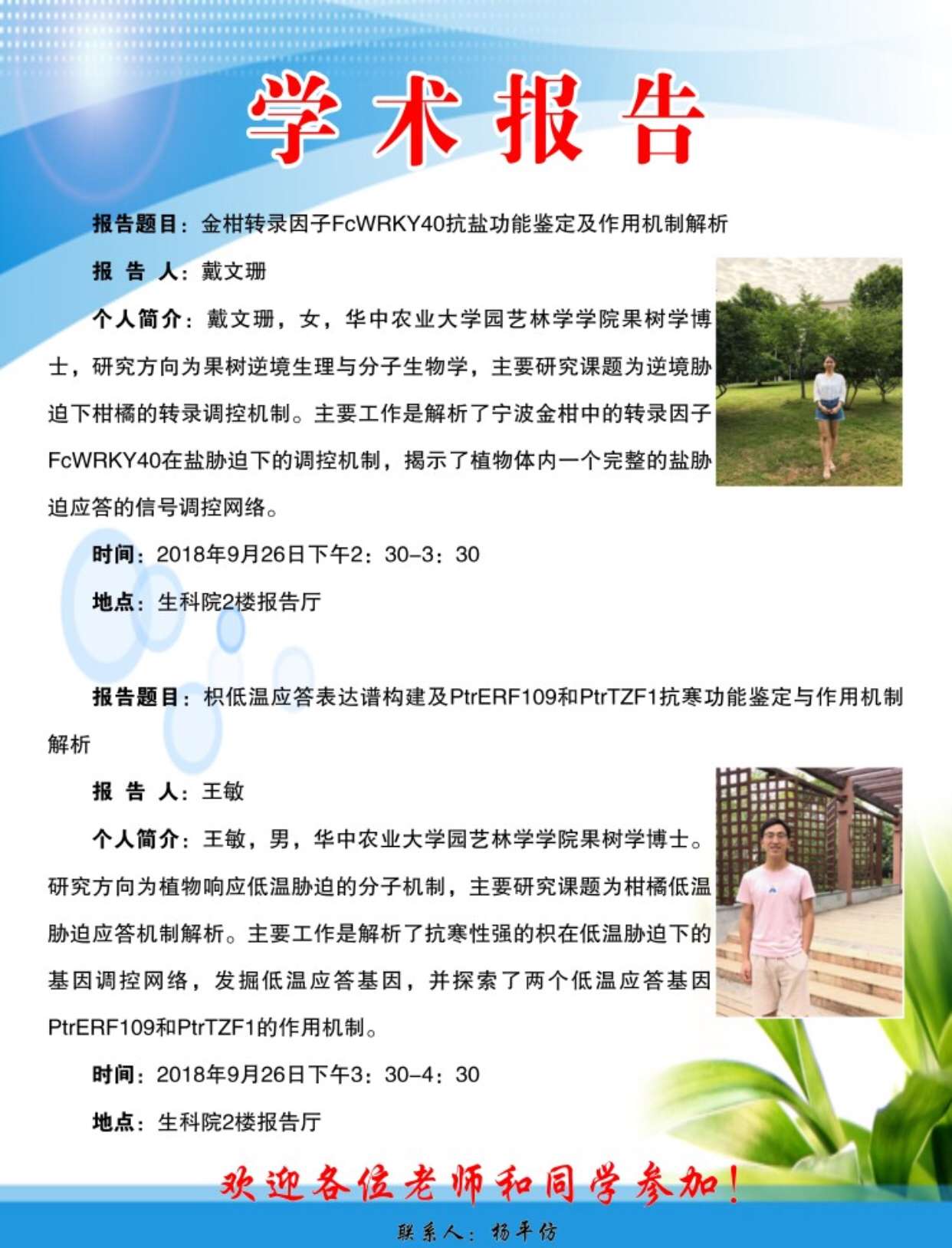 学术报告:金柑转录因子FcWRKY40抗盐功能鉴定及作用机制解析