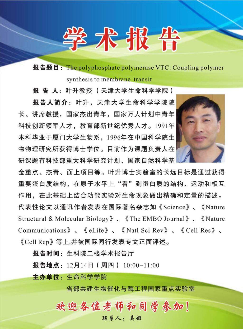 学术报告:The polyphosphate polymerase VTC: Coupling polymer synthesis to membrane transit