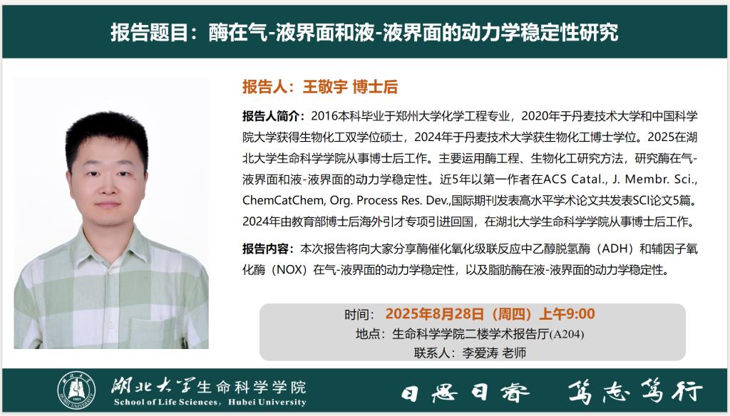 学术报告:酶在气-液界面和液-液界面的动力学稳定性研究