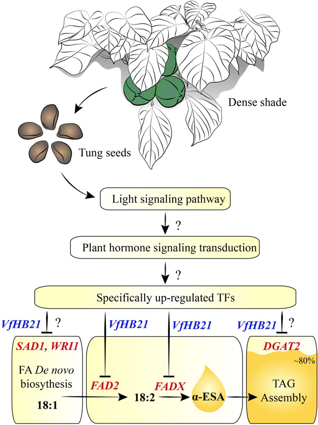 (2)揭示了遮荫条件下抑制油桐种子油脂合成及桐酸积累的分子机制(The Plant Journal, (2021), 108, 1735–1753)。