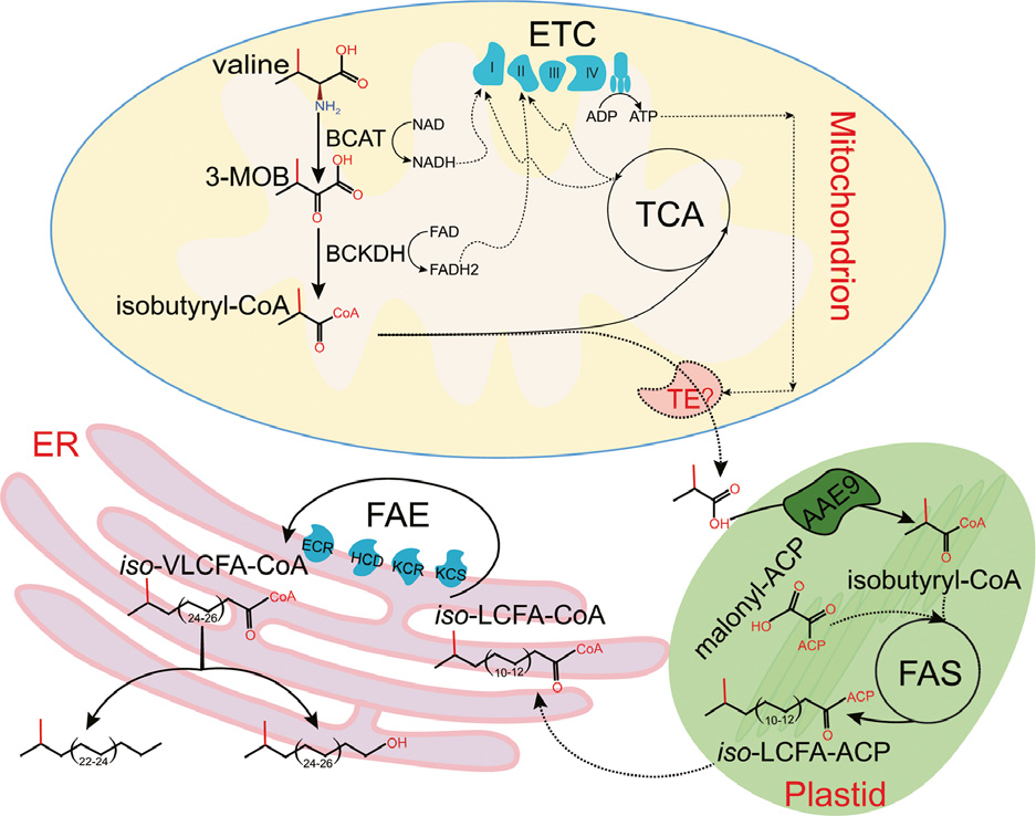 (2)明确了拟南芥支链蜡质合成的起始分子来源于支链氨基酸缬氨酸的代谢产物----异丁酸,并克隆和鉴定了联系支链氨基酸代谢和支链蜡质合成两大途径的关键酶AAE9(New Phytologist, (2022) 233: 2458–2470);