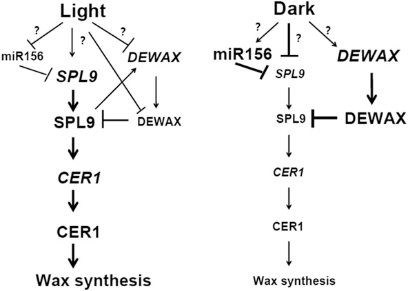 (1)首次证实microRNA156的靶蛋白SPL9受光照诱导正向调控蜡质合成,并且该蛋白和黑暗条件下抑制蜡质合成的抑制因子DEWAX会形成SPL9-DEWAX模块,通过转录激活-抑制的动态调控过程,参与昼夜光暗转换对蜡质合成的调节。该研究不仅丰富了植物蜡质合成在转录及转录后水平的调控通路,而且首次明确各种环境信号对于蜡质合成的调控,不是一个相互独立的过程,而是通过相应的调控模块有机整合在一起(Plant Cell, 2019, 31: 2711–2733)。