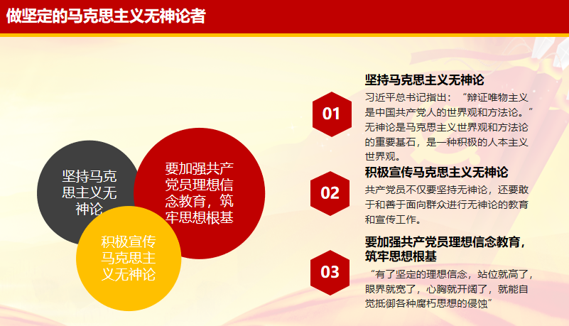 活动第二部分指出,做坚定克思主义无神论者要求我们首先要坚持马克思主义无神论。其次要积极宣传马克思主义无神论。辩证唯物主义是中国共产党人的世界观和方法论。无神论是马克思主义世界观和方法论的重要基石,是一种积极的人本主义世界观。共产党员不仅要坚持无神论,还要敢于和善于面向群众进行无神论的教育和宣传工作。