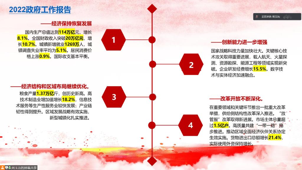 首先,周玉洁同志对两会的相关知识进行了简单介绍,为大家讲解本次全国两会的名称、时间、代表选拔的方式以及两会的主要职能。接着,周玉洁同志围绕几个吸睛的大数字对2022年的政府工作报告进行讲解,并组织全体党员观看了政府工作报告的缩影小视频。该视频总结了一年来中国的发展全貌,展现出在过去一年里,中国的经济保持恢复发展,创新能力进一步增强,经济结构和区域布局继续优化,改革开放不断深化,生态文明建设持续推进,人民生活水平稳步提高,疫情防控成果持续巩固。