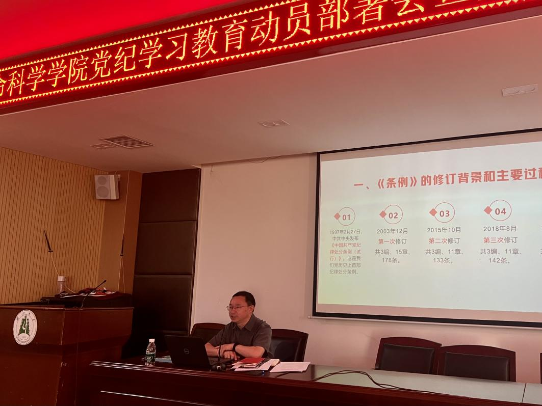 学院党委书记谢玉平作动员讲话。他指出,在全党开展党纪学习教育,是以习近平同志为核心的党中央作出的重大决策部署,是今年党建工作的一项重要政治任务。他强调,全体党员应深刻认识党纪学习教育的目标任务,准确领会《中国共产党纪律处分条例》的精神实质与精髓要义,一是深化认识,把握党纪学习教育的重大意义,要不断增强开展党纪学习教育的责任感使命感紧迫感,切实把思想和行动统一到党中央关于党纪学习教育部署要求上来;二是抓住重点,落实党纪学习教育的目标任务,要原原本本学、逐章逐条学,联系实际学、带着问题学,在学习贯彻《中国共产党纪律处分条例》上下功夫、见成效;三是聚焦主业,深化党纪学习教育的实践运用,要在破解发展难题上下功夫,充分发挥高质量党建的引领和保障作用,汇聚学院一流学科建设的蓬勃合力。
