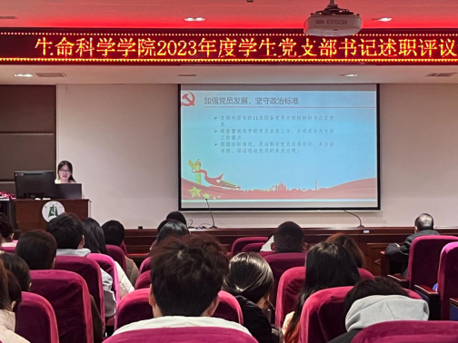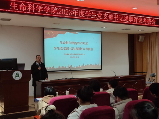 在学生党支部书记述职评议考核会议上,15名学生党支部书记围绕支部基本情况、履职情况、抓支部党建的主要做法和亮点、党建工作中存在的不足之处及下一步改进措施等方面进行述职汇报。