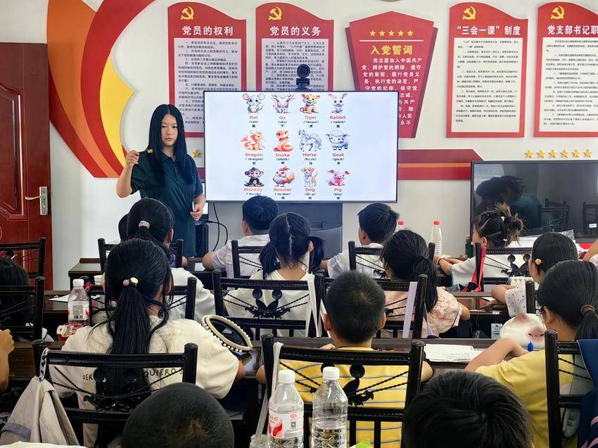 次日课程中,志愿者将教学维度从生活场景延伸至文化领域,以十二生肖为载体搭建双语学习桥梁。志愿者逐一讲解“机灵鼠)”“强壮牛)”等表达,每个生肖都配上精准的英文形容词,既强化词汇记忆,又传递文化内涵。特别将“龙”译为“loong”,区别于西方“dragon”的负面含义,贴合中华文化内涵,细节处彰显用心。